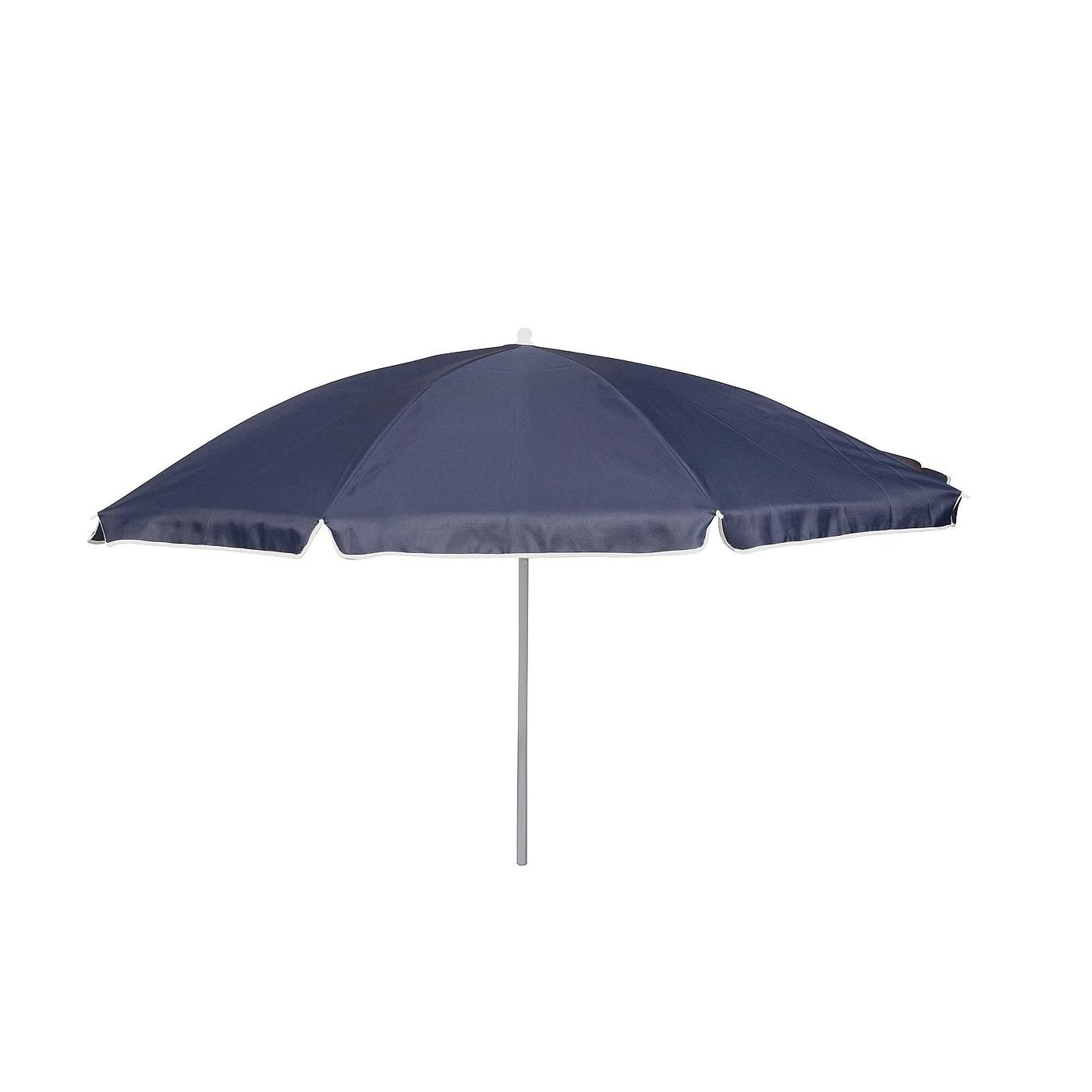 Kleur: blauw Materiaal: polyester (160 g/m²) en staal Afmetingen: 200 x 200 cm (Ø x H) met Ø 25 mm paal Gewicht: 2,2 kg Kantelmechanisme Met arm en stalen paal In hoogte verstelbaar Deelbare stalen paal Zilverkleurige binnencoating voor uv-bescherming