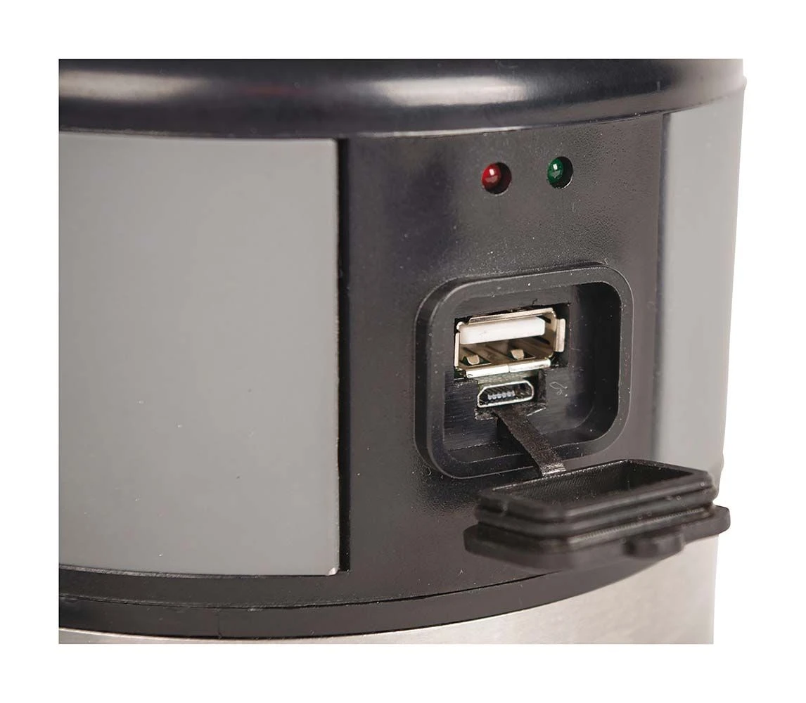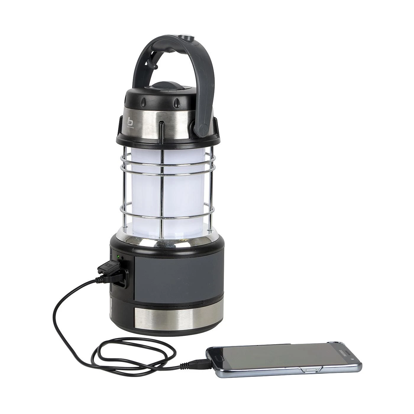 Een robuuste tafellantaarn. Door high power LED’s met een warme lichtkleur, de traploze dimmer en de witte matte kap worden een aangename verlichting gerealiseerd. De ingebouwde Li-ion accu kan met de meegeleverde USB kabel opgeladen worden. De accu kan tevens worden gebruikt om bijvoorbeeld een mobiele telefoon op te laden via de USB uitgang. In het hengsel zit een kompasje en een inklapbaar ophanghaakje. Brandduur: 100-9 uur. Lichtopbrengst: 8-220 lumen.