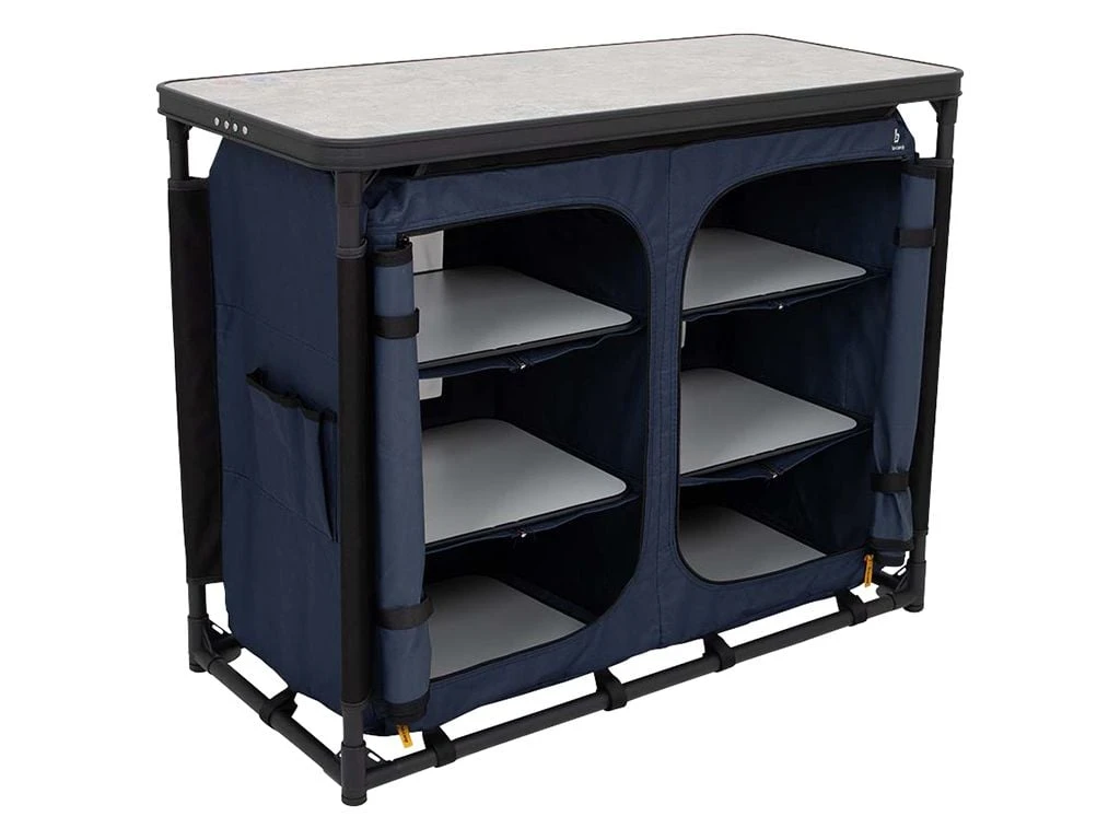 Dankzij de verstelbare poten staat de kast stabiel op elke ondergrond, perfect voor kampeerkeukens of tuinfeesten.