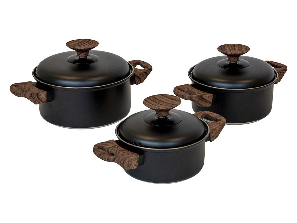 Wil je stijlvolle pannen gebruiken om heerlijke maaltijden te bereiden? Dankzij het zwarte roestvrij staal en de houtlook knoppen hebben deze pannen een industriële uitstraling.