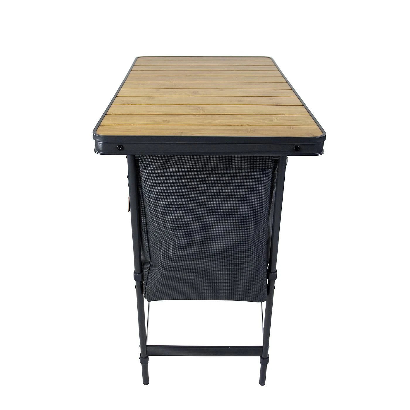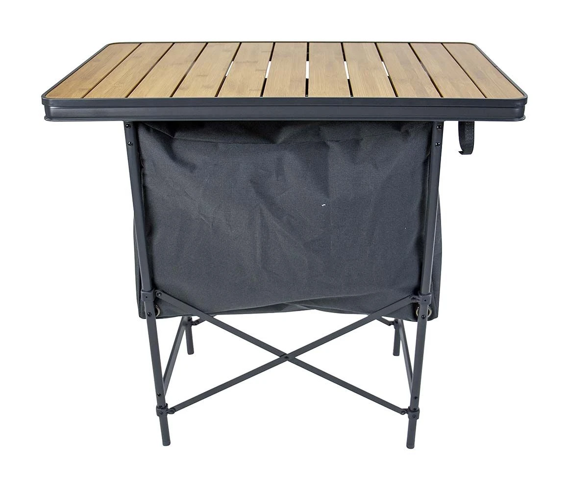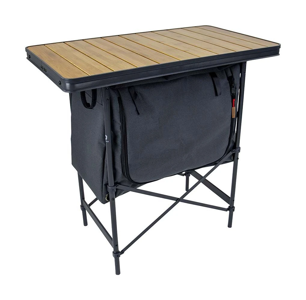 Een stijlvolle kookkast met aluminium frame. Het kookmeubel is voorzien van een bamboe blad. Verder is de kast compact opvouwbaar in de bijgeleverde draagtas door de poten naar elkaar toe te schuiven en neer te liggen onder het blad. De kast bestaat uit 1 vak waar een stevige inlegplak in ligt. Ook is het tafelblad hittebestendig en watervast.