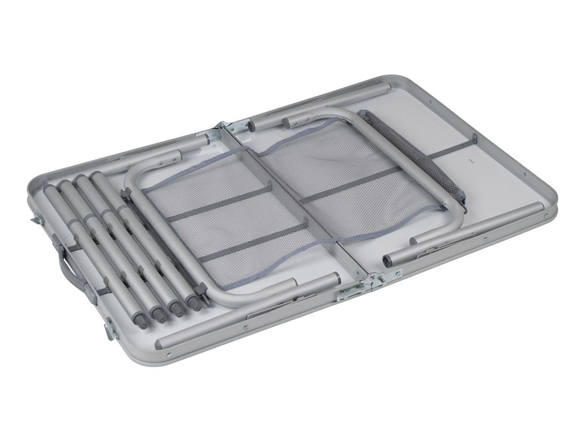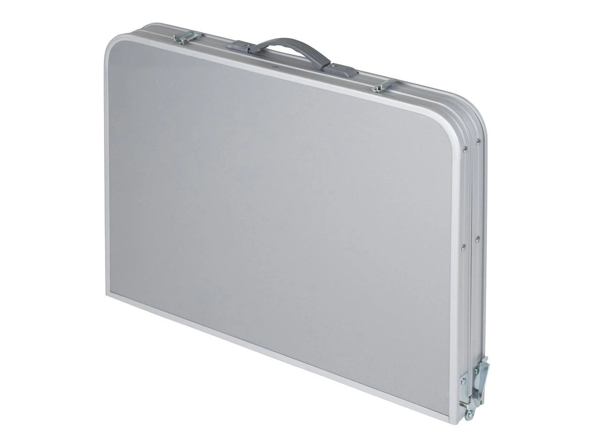Deze compacte tafel van Bo-Camp kun je eenvoudig mee nemen doordat hij is in te klappen tot een handig koffermodel. De tafel heeft uitgeklapt een afmeting van 90 x 60 cm en is verstelbaar in vier verschillende hoogtes (36/50/67/81 cm). Alle vier de poten zijn voorzien van stelschroeven voor de fijnafstelling. Onder het blad zit een handig lectuurnet zodat je altijd je boek of tijdschrift in de buurt hebt.