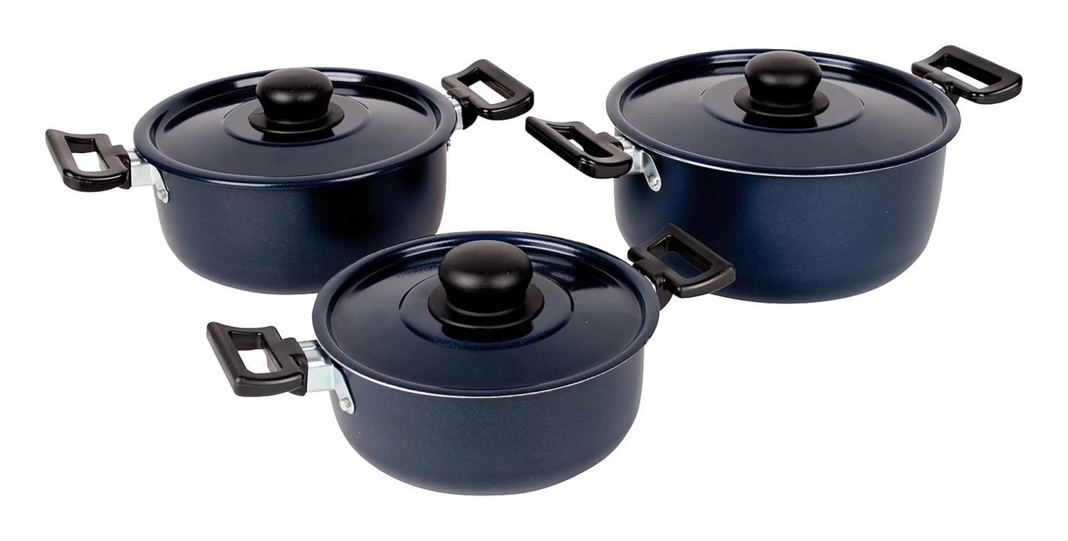 Een 3-delige pannenset. Deze kookpannen zijn gemaakt van lichtgewicht aluminium. Daarnaast is iedere pan voorzien van comfortabele en hittebestendige handgrepen, een anti-aanbaklaag en een deksel. Te gebruiken op de warmtebron gas. Afmetingen (Øxh): 20×9,5, 18×8,5 en 16×7,5 cm. Inhoud: 1,4, 2 en 2,8 liter.
