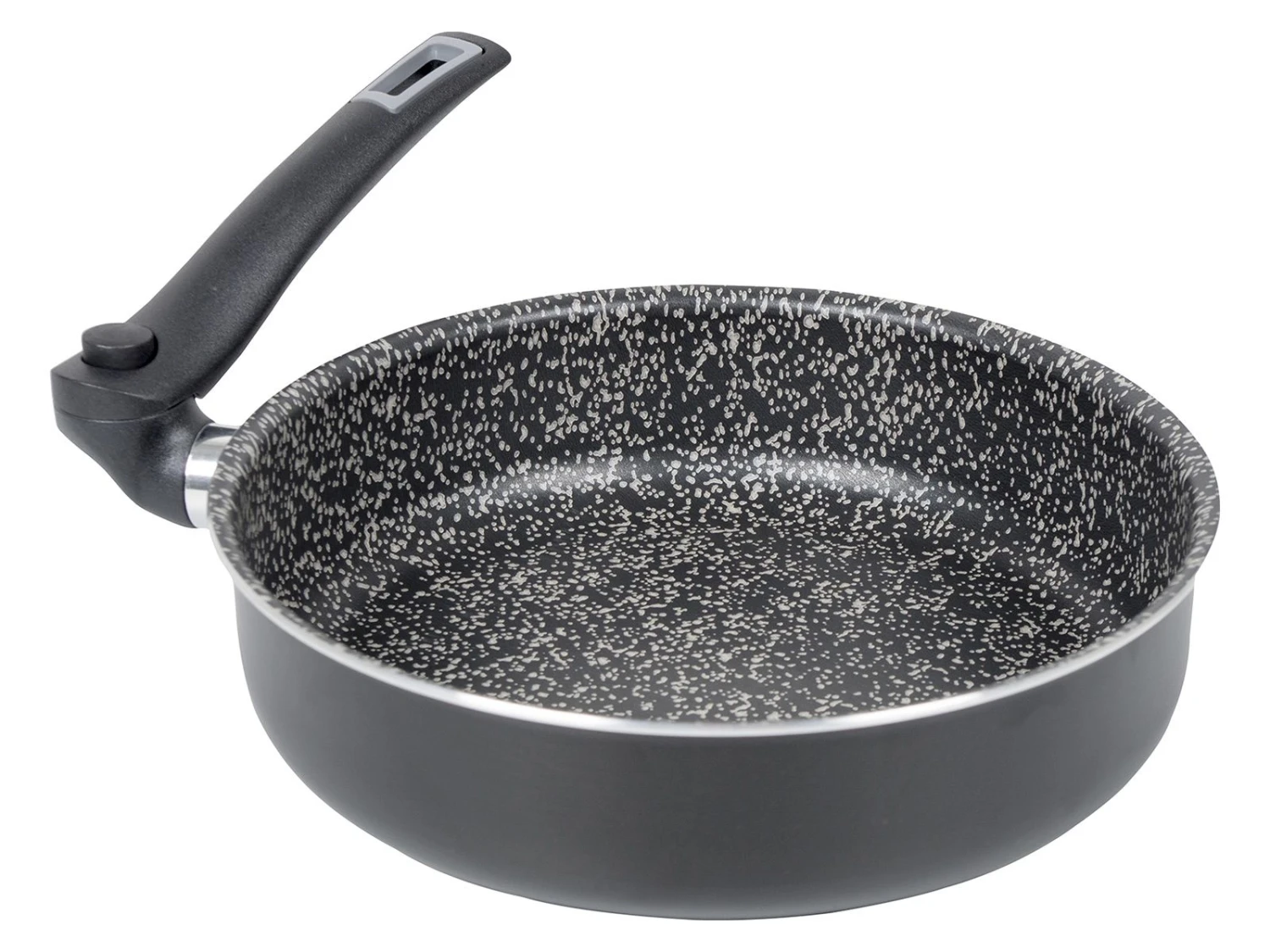 De Bo-Camp hapjespan Turn is een aluminium hapjespan met een hoge opstaande rand. Deze lichtgewicht pan is voorzien van een 5-laags Salus Stone® coating en een anti-slip onderkant. Door de wegklapbare handgreep is de pan ruimtebesparend en makkelijk mee te nemen.