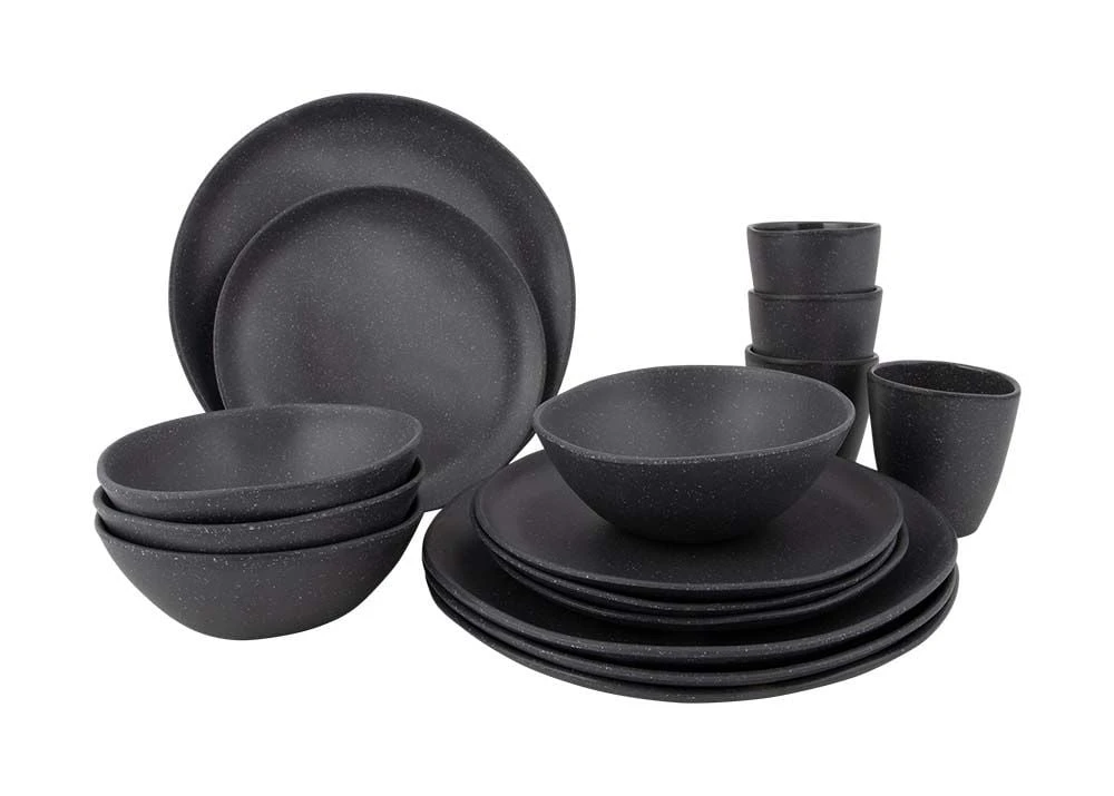 Deze donker grijze Hoxton serviesset uit de Urban Outdoor collectie heeft een stoere en steenachtige uitstraling. Naast het robuuste design is het servies zeer licht en stevig. Het servies is goed te gebruiken op de camping, aangezien deze vrijwel onbreekbaar en kraswerend is. Daarnaast is het Hoxton servies ook uitstekend om thuis en in de tuin te gebruiken! De 16-delige set is gemaakt van hoogwaardig 100% melamine, vaatwasmachinebestendig en food approved. Deze stijlvolle set is geschikt voor 4 personen en bestaat uit 4 dinerborden, 4 ontbijtborden, 4 kommen en 4 mokken. Afmetingen: Ø Bord: 26 cm. Ø Bord: 20,5 cm. Ø Kom: Ø 15 cm Mok: Ø 8,5 cm. Inhoud Kom: 500 ml. Inhoud Mok: 250 ml.
