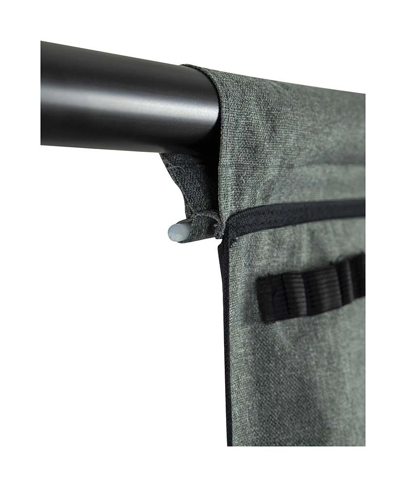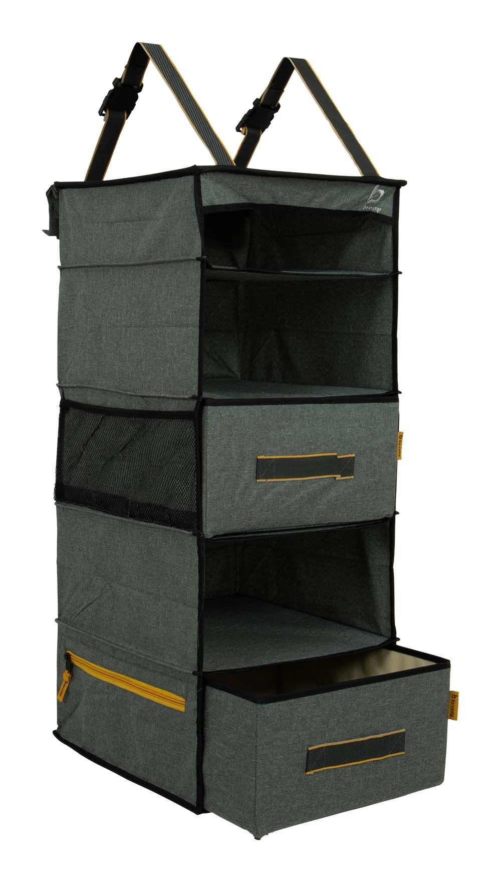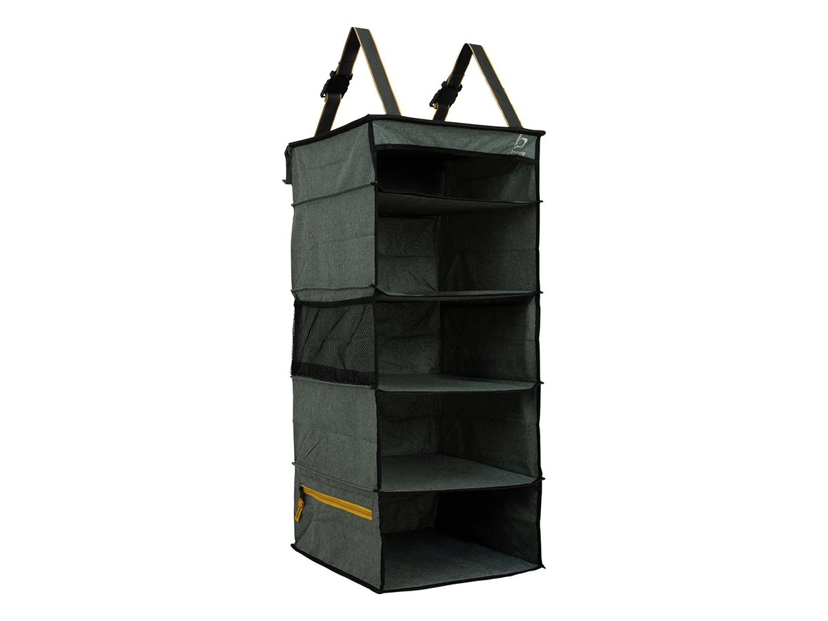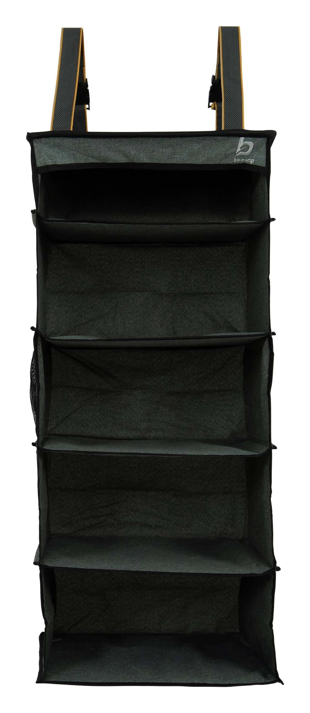 Een opvouwbare 5-vaks hangkast uit de Industrial collection. Beschikt over 5 vakken waar optioneel een lade in geplaatst kan worden (niet meegeleverd). Inclusief 2 mesh zijvakken en 2 zijvakken met rits. Eenvoudig te bevestigen met de straps aan een tentstok. De lussen onderaan zorgen voor extra fixatie. Gemaakt van extra stevig Cationic.